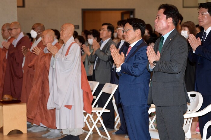 | ▲ 강기정 광주광역시장이 부처님 오신 날인 27일 봉축법요식에 참석해 합장하고 있다. / 광주광역시 제공 |