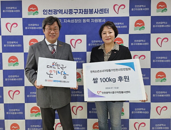 [인천=김형만 기자] 인천중구자원봉사센터(이하 중구센터)는 전국소년소녀가장돕기 인천시민연합회(이하 전가연)로부터 쌀100kg을 후원 받았다고 12일 밝혔다.