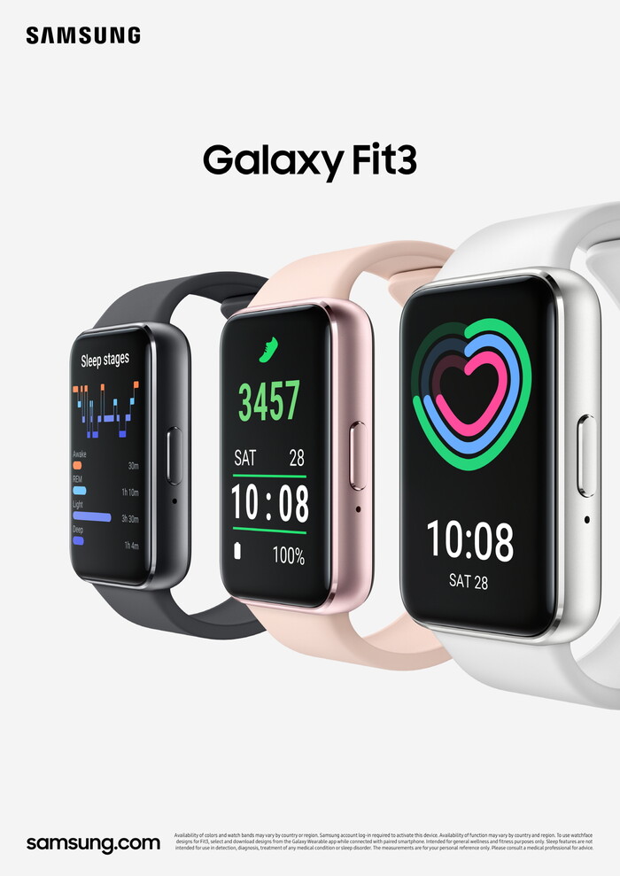 '갤럭시 핏3'는 그레이·실버·핑크 골드 3가지 색상으로 구주, 아시아, 중남미 등의 일부 국가에서 23일부터 순차 출시된다.