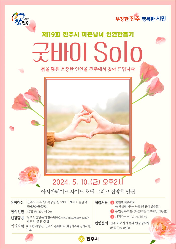 이번 행사는 ‘굿바이 SOLO’를 주제로 커플 레크레이션, 커플댄스, 스탠딩 토크, 감성코드 찾기 등 다양한 활동을 통해 서로를 알아가는 시간을 가질 예정이며, 행사 종료 후에도 참가자들의 온라인 모임이나 진주시 관광을 소재로 한 이벤트 등을 통해 행사의 지속 효과를 이어갈 계획이다.