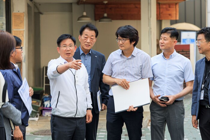 | ▲ 지난 6월 동진시장을 찾아 시설점검에 나선 박강수 구청장(왼쪽 두 번째). (사진=마포구청 제공) |