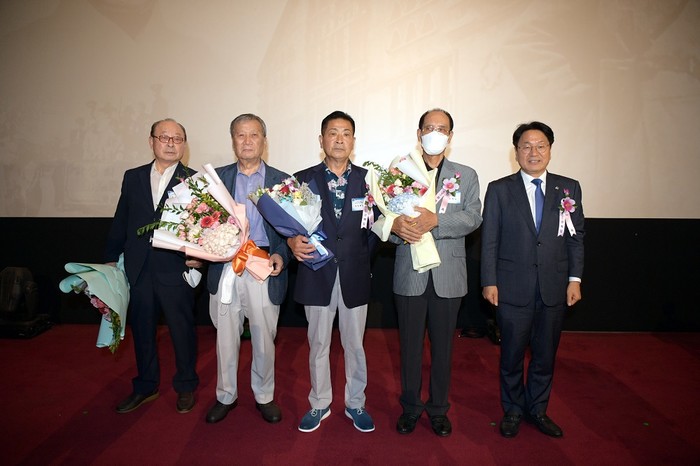 | ▲ 강기정 광주광역시장(오른 쪽 첫 번째)이 15일 오전 광주극장에서 열린 제77주년 광복절 경축식에 참석해 독립유공자에게 포상한 후 기념촬영을 하고 있다./광주광역시 제공 |