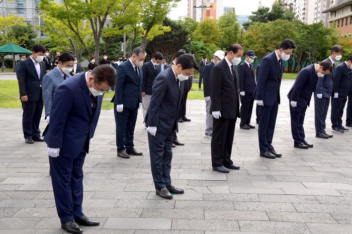 | ▲ 강기정 광주광역시장(앞줄 왼 쪽부터 두 번째)이 15일 오전 상무시민공원 내 광주독립운동기념탑에서 제77주년 광복절 기념 헌화를 한 후 참석자들과 함께 묵념을 하고 있다./광주광역시 제공 |