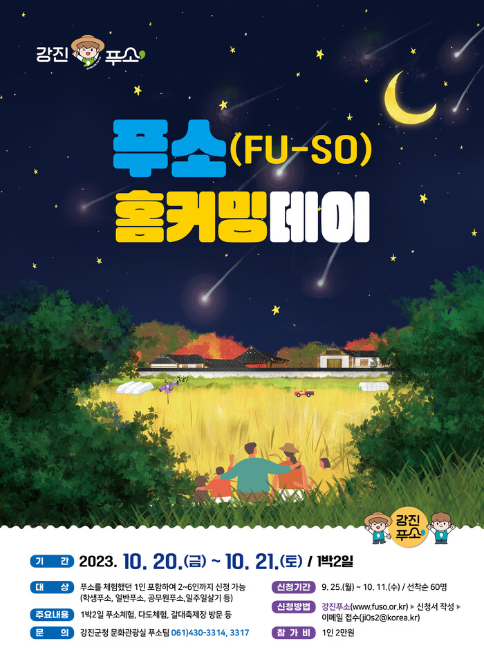 참가 대상은 학생 푸소, 공무원 푸소, 일주일 살기 등 강진에서 진행한 푸소에 한 번이라도 참여했던 체험객과 그 일행으로, 최대 6명까지 신청 가능하다. 접수는 25일부터 시작해 선착순 60명을 모집한다.