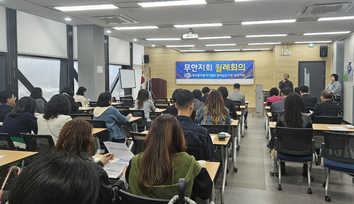 [무안=황승순 기자]전남 무안군(군수 김산)은 지난 27일 전남전문건설회관에서 열린 한국공인중개사협회 무안지회 월례회의에서 공인중개사 60여명을 대상으로 상세 주소 부여 확대 교육과 홍보활동을 진행했다.