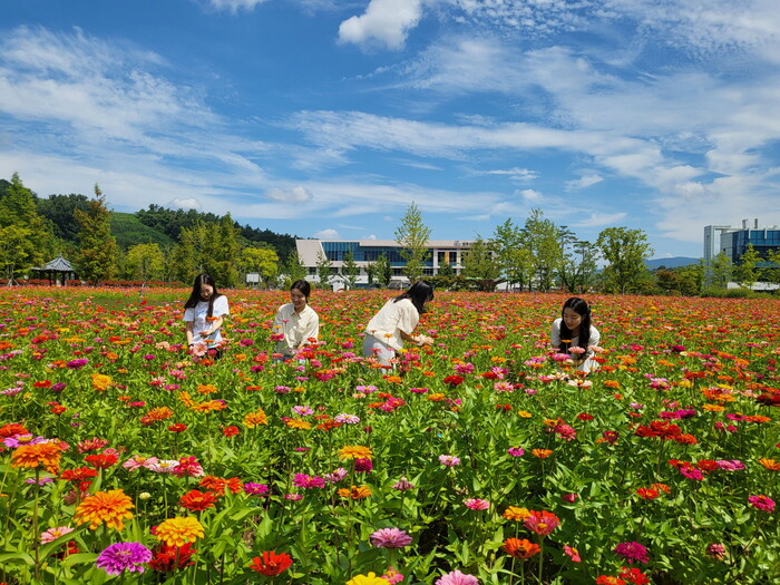 진주시는 지역의 새로운 힐링 명소로 자리잡고 있는 ‘두메실농업테마파크’ 내 경관작물원에 형형색색 백일홍 꽃이 화려하게 피어 아름다운 경관을 연출하고 있다고 전했다.