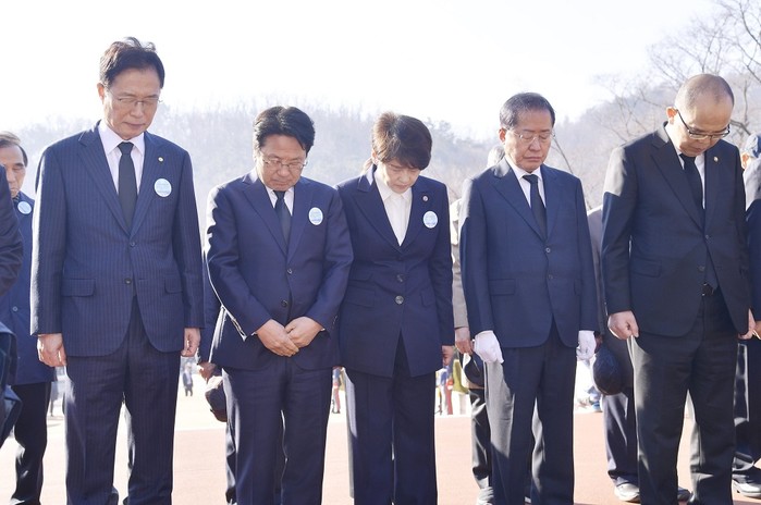 | ▲ 강기정 광주광역시장이 28일 오전 대구 달서구 두류공원 내 2·28민주운동 기념탑을 찾아 한덕수 국무총리, 홍준표 대구광역시장 등과 참배를 하고 있다./광주광역시 제공 |