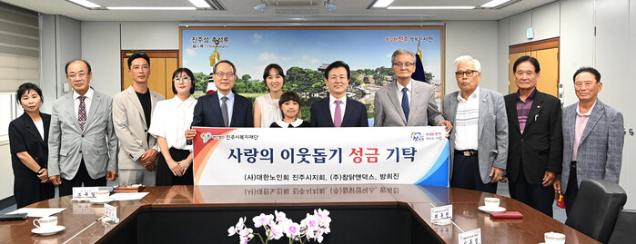 이날 기탁식에서 (사)대한노인회 진주시지회(지회장 최동권)에서 성금 2000만 원, ㈜참닭앤덕스(대표 송길동)에서 성금 500만 원, 방희진 학생이 성금 100만 원을 집중호우 피해 주민 지원을 위해 기탁했다. 특히 방희진 학생은 음악 콩쿠르 대상 상금을 기부해 훈훈함을 더했다.