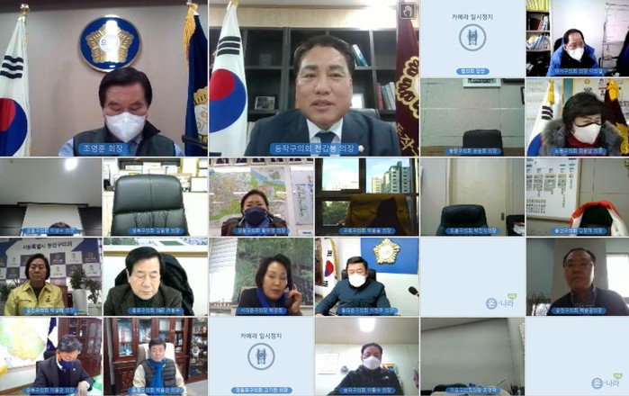 | ▲ 2월 월례회의에 참여한 의장들이 영상회의를 하고 있다.(사진제공=동작구의회) |