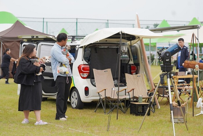 | ▲ 박람회장을 찾는 캠핑 관광객이 반려견과 함께하는 ‘전라남도 펫 페스티벌’ 전시제품을 둘러보고 있다. / 해남군 제공 |