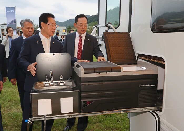 | ▲ 명현관 해남군수가 김영록 도지사와 함께 캠핑관광박람회에 출품된 한 기업의 캠핑용품을 살펴보고 있다. / 해남군 제공 |