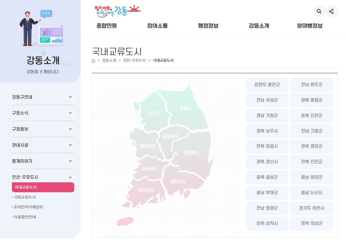 우선 강동구와 교류하고 있는 국내외 도시를 지도상에서 한눈에 확인할 수 있도록 직관적인 변화를 줬다. 도시 이름에 마우스를 올려두면 지도상 위치가 표출되고 클릭하면 해당 도시에 대한 상세 정보를 알려준다.