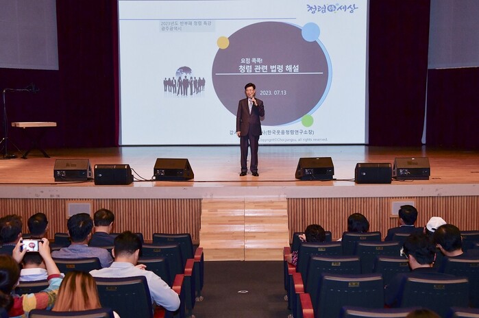 [광주=정찬남 기자] 광주광역시(시장 강기정)는 13일 시청 대회의실에서 시·자치구·공공기관 임직원과 청렴사회민간협의회원 등 500여 명이 참석한 가운데 ‘청렴 라이브’ 교육을 실시했다.