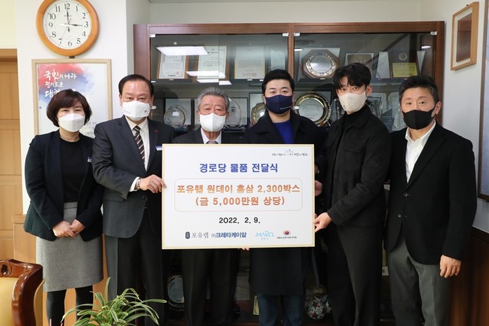 서울 마포구는 건강기능식품 전문 기업 (주)크레타케이알로부터 지난 9일 홍삼세트 2300상자(환가액 5000만원 상당)를 전달받았다. 전달받은 홍삼세트는 대한노인회 마포구지회를 통해 지역내 경로당 155곳에 전달될 예정이다. 사진은 전달식에서 유동균 구청장(왼쪽에서 두 번째)과 관계자들이 기념촬영을 하는 모습.(사진제공=마포구청)
