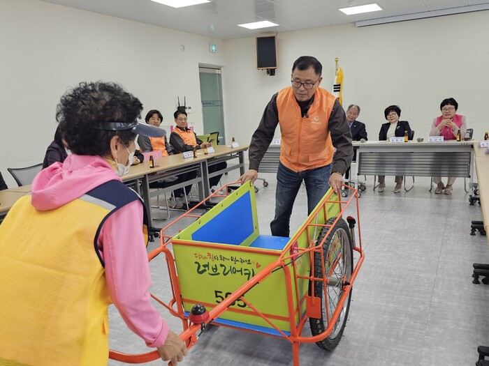 진주시자원봉사센터는 16일 상봉동행정복지센터에서 폐자원 수집 어르신의 자활을 지원하기 위한 ‘사랑의 리어카’ 전달식을 가졌다.