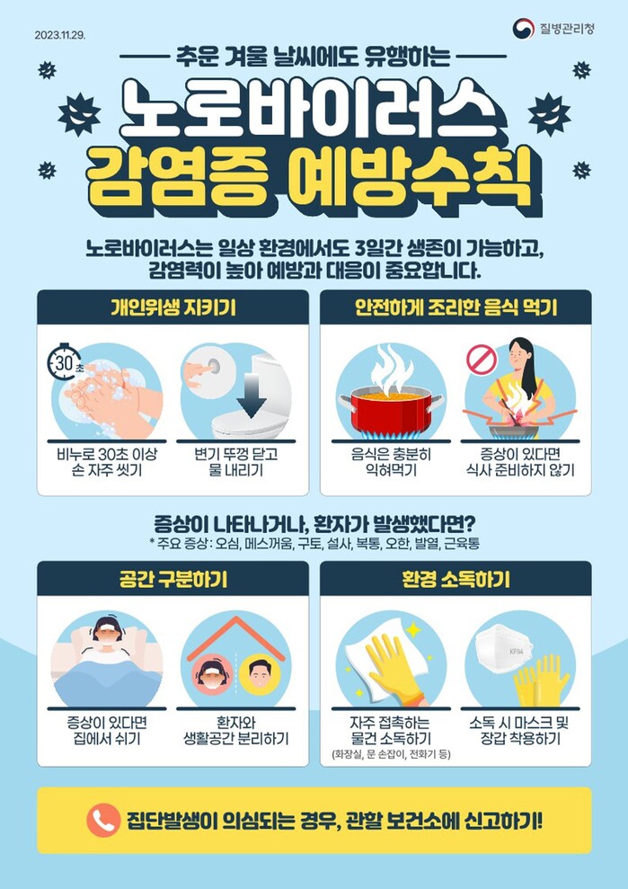 시 관계자는 “최근 노로바이러스 감염증 환자 수가 증가 추세이며, 특히 영유아가 다수를 차지하고 있다. 영유아 보육시설 및 학교에서는 유 증상자 등원 자제와 환자 사용 공간 소독을 철저히 하고, 집단환자 발생 시 즉시 보건소로 신고해 달라”고 당부했다. 덧붙여 “노로바이러스 감염증 예방을 위하여 손 씻기 등 예방수칙을 준수할 것”을 강조했다.
