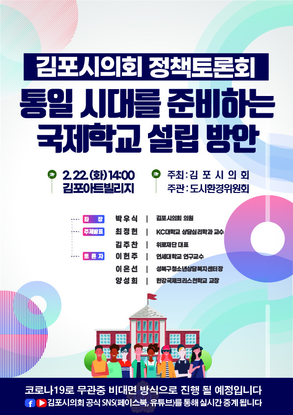 [김포=문찬식 기자] 경기 김포시의회가 ‘통일 시대를 준비하는 국제학교 설립방안’을 찾기 위해 오는 22일 오후 2시 김포아트빌리지 다목적홀에서 정책토론회를 개최한다.