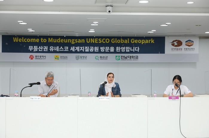 | ▲ 트란반(베트남), 키미아 아자애비(이란)가 지난 22일 광주광역시청 3층 중회의실에서 열린 '무등산권 세계지질공원 재인증 현장실사 최종 심의' 를 하고 있다. / 광주광역시 제공 |