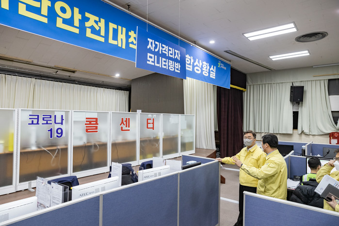 서울 광진구는 최근 오미크론 여파로 확진자가 급증함에 따라 재택치료 관리체계 효율화를 위해 보건소 감염병 및 행정지원 업무 공간을 일원화해 광진구 재난안전대책본부 종합상황실을 확대 운영한다. 사진은 지난 9일 김선갑 구청장(왼쪽)이 재난안전대책본부 종합상황실을 방문한 모습.(사진제공=광진구청)