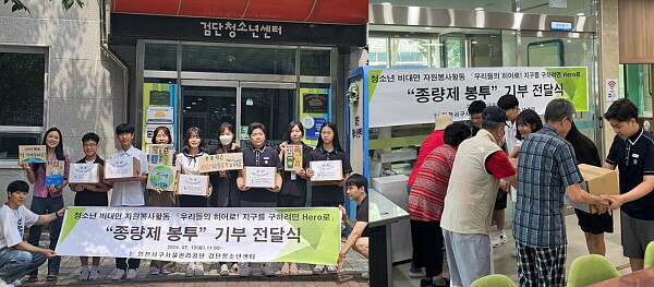 이날 기부된 종량제 봉투는 청소년 233명이 지난 4~5월 “우리들의 히어로! 지구를 구하려면 Hero로!” 자원봉사 프로그램을 통해 모은 우유팩 2,330개와 교환한 것으로, 검단행정복지센터는 10리터 종량제 봉투를 독거노인 5명에게 233매를 전달했다.