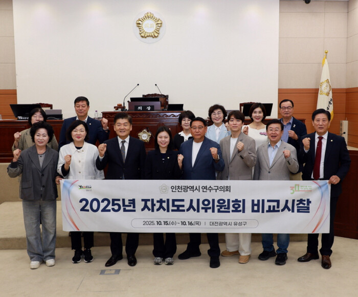 | 대전 유성구 도시재생·문화관광 우수사례 벤치마킹 참가자들이 파이팅을 외치고 있다. (사진=연수구의회) |