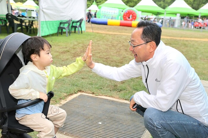 | ▲ 명현관 해남군수가 어린이날을 맞아 부모와 함께 해남공룡축제장을 찾은 어린이와 손 인사를 나누고 있다. / 해남군 제공 |