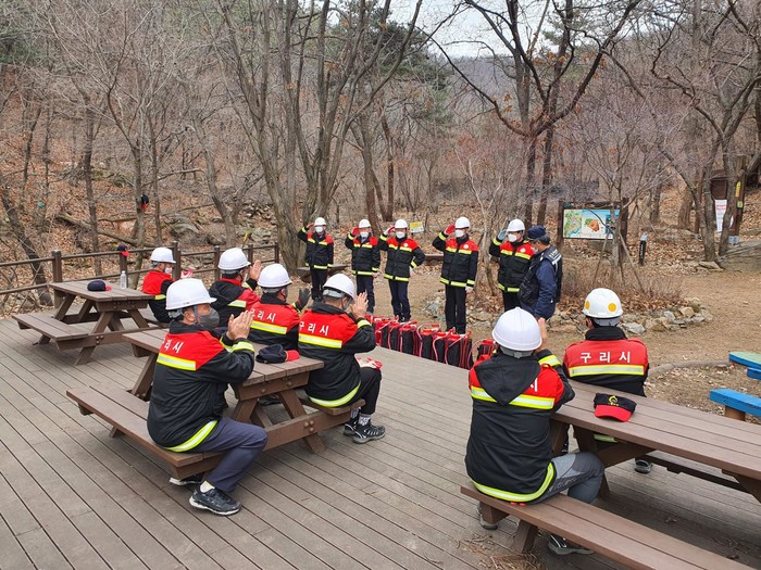 경기 구리시가 최근 이틀간 구리시 산불전문예방진화대의 산불진화 역량 강화를 위한 교육훈련을 실시했다. 교육훈련은 한국산불방지기술협회 강사를 통해 산불의 발생원인 등 이론 교육과 구리시 자체 보유 산불 진화장비를 활용한 실습 훈련으로 나눠 진행됐다. 사진은 훈련이 진행되고 있는 모습. (사진제공=구리시청)
