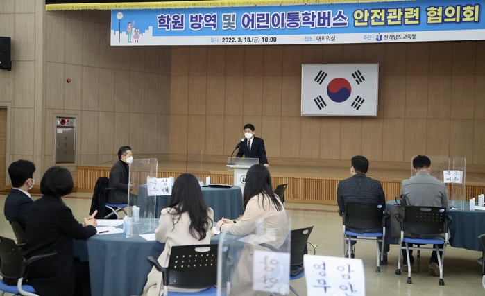 전남도교육청이 18일 청사 2층 대회의실에서 학원방역 및 어린이 통학차량 안전관리 협의회를 열고 코로나19 위기 속 새 학기를 맞은 학교정상화 방안을 모색했다. 이날 회의에는 장석웅 교육감을 비롯 전남도학원연합회장, 각 지역별 학원 분회장 등이 참석해 전남의 지리적 위치 및 학원 업종별·규모별 특성을 반영한 학교-학원 연계 방역체계 구축 방안에 대해 집중 논의했다. 사진은 협의회 진행 모습. (사진제공=전남도교육청)