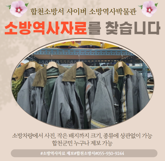 합천소방서(서장 김진옥)는 2022년 개설을 목표로 추진 중인 ‘사이버 소방역사박물관’에 전시할 소방역사자료에 대하여 제보를 받고 있다고 밝혔다. 합천소방서 사이버 소방역사박물관은 합천소방서 홈페이지에 개설할 예정인데 합천군 곳곳에 숨겨진 소방 관련 역사자료를 발굴하여 영구히 보존하고 소방역사를 재조명하기 위해 추진된다.