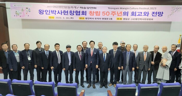 | ▲ 우승희 영암군수(가운데)가 왕인박사현창협회 창립 50주년의 회고와 전망 왕인 학술강연회에 참석해 관계자들과 기념촬영을 하고 있다. / 영암군 제공 |
