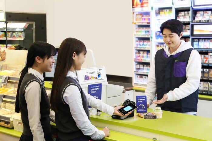 | ▲ 학생들이 CU 편의점에서 삼성월렛으로 결제하는 모습.(사진=삼성전자 제공) |