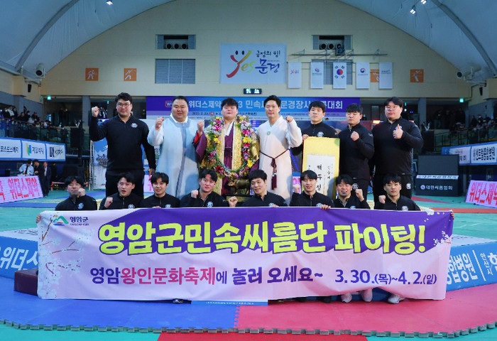 | ▲ 영암군 민속씨름단이 지난 23일부터 27일까지 경상북도 문경시 문경 실내체육관에서 개최된 2023년 문경장사씨름대회에서 한라, 백두, 단체전 우승을 차지하고 오는 3월 30일부터 4월 2일까지 열리는 영암왕인문화축제 홍보 기념촬영을 하고 있다. / 영암군 제공 |