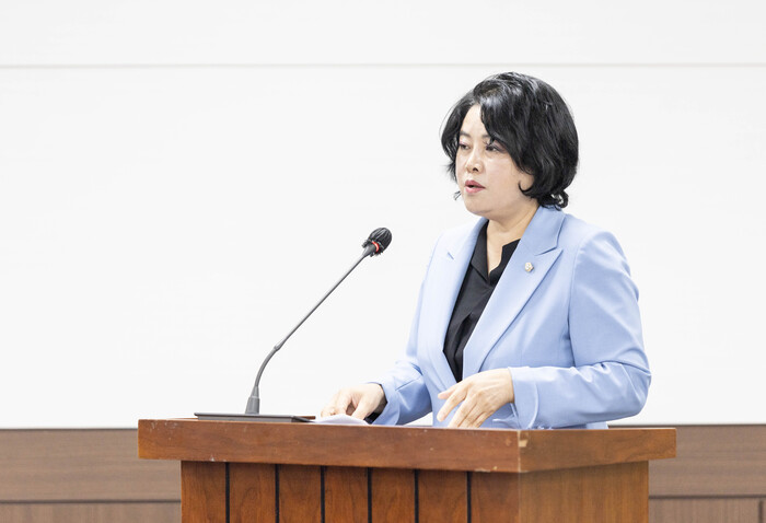 | 안산시의회 김진숙 의원이 지난 10월 16일 제285회 임시회 의회운영위원회에서 ‘안산시의회 교섭단체 및 위원회 구성과 운영에 관한 조례 일부개정조례안’에 대해 제안 설명을 하고 있는 모습. 사진제공=안산시의회 |