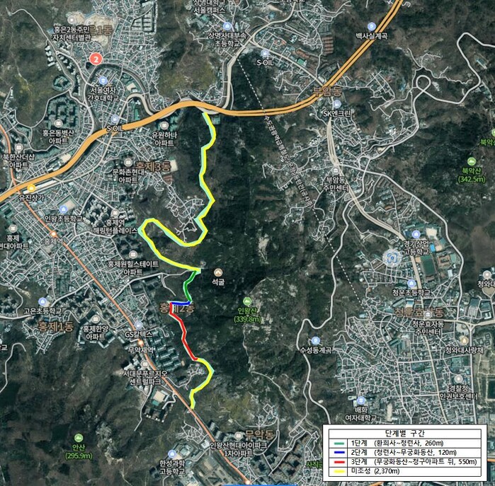 | ▲ ‘서대문구 인왕산 무장애길’ 단계별 구간 위치도. (사진=서대문구청 제공) |