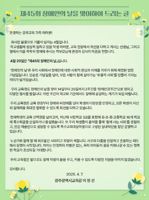[광주=황승순 기자]광주시교육청(교육감 이정선)은 ‘제45회 장애인의 날’(4월20일)을 앞두고 ‘2025 장애 인권 주간’을 운영한다.