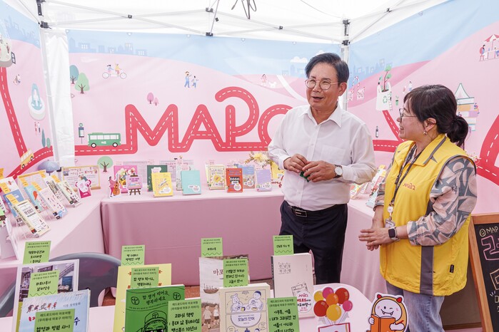 | ▲ 최근 박강수 구청장이 더 북 데이 행사 현장에 마련된 북 큐레이션 부스를 방문한 모습. (사진=마포구청 제공) |