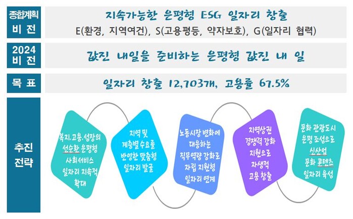 5대 추진 전략은 ▲복지·고용·성장의 선순환 은평형 사회서비스 일자리 지속적 확대 ▲지역 및 계층별 수요를 반영한 맞춤형 일자리 발굴 ▲노동시장 변화에 대응하는 직무역량 강화로 자립지원형 일자리 연계 ▲지역상권 경쟁력 강화 지원으로 자생적 고용 창출 ▲문화관광도시 은평 조성으로 신산업 문화콘텐츠 일자리 육성이다.