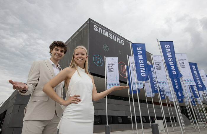 또한 삼성전자는 전시장에 마련된 가로 길이 20미터의 대형 스크린에서 상영하는 신제품 영상에 부산 엑스포 엠블럼을 포함하고, 전시장 곳곳에 엑스포 응원 문구를 게재했다.