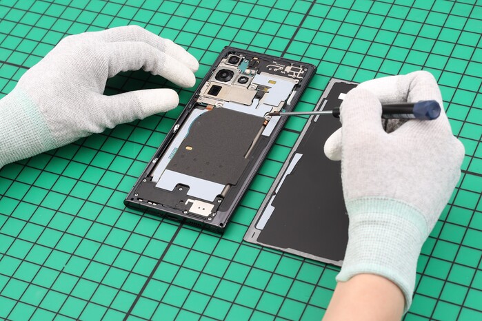 | ▲ 갤럭시 S22 울트라 제품을 자가 수리 하는 모습.(사진=삼성전자 제공) |