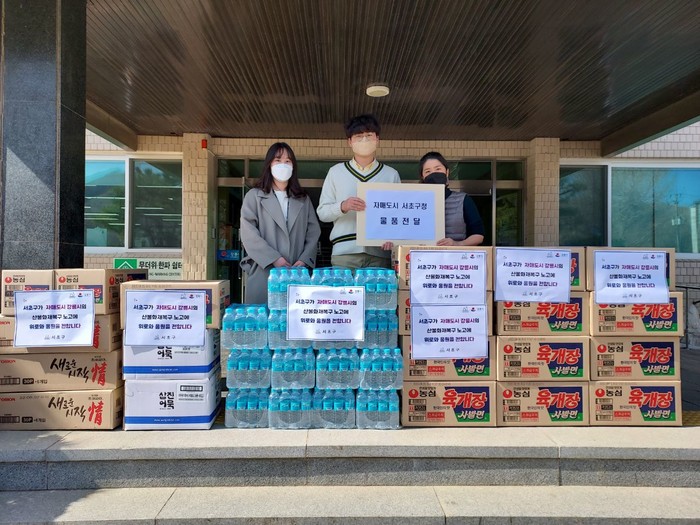 서울 서초구는 최근 대형 산불피해를 입은 자매도시 울진군·강릉시에 구호물품을 지원했다. 구는 산불피해 이재민과 봉사자를 위한 구호물품 생수·컵라면 등을 울진군 재난상황본부 및 강릉 옥계면사무소에 직접 전달했다. 사진은 전달식에서 관계자들이 기념촬영을 하는 모습. (사진제공=서초구청)