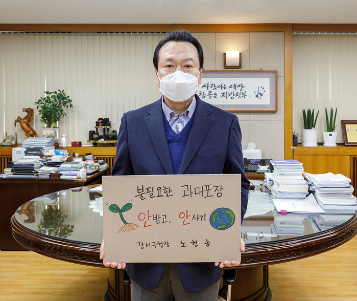 노현송 서울 강서구청장이 지난 17일 ‘과대포장 안 받고 안 사기’ 챌린지에 동참해 실천 문구가 적힌 손팻말을 들어 보이며, 폐기물 감량 운동에 대한 구민들의 적극 참여를 호소했다. 사진은 노 구청장이 ‘과대포장 안 받고 안 사기’ 챌린지에 동참하고 있는 모습. (사진제공=강서구청)