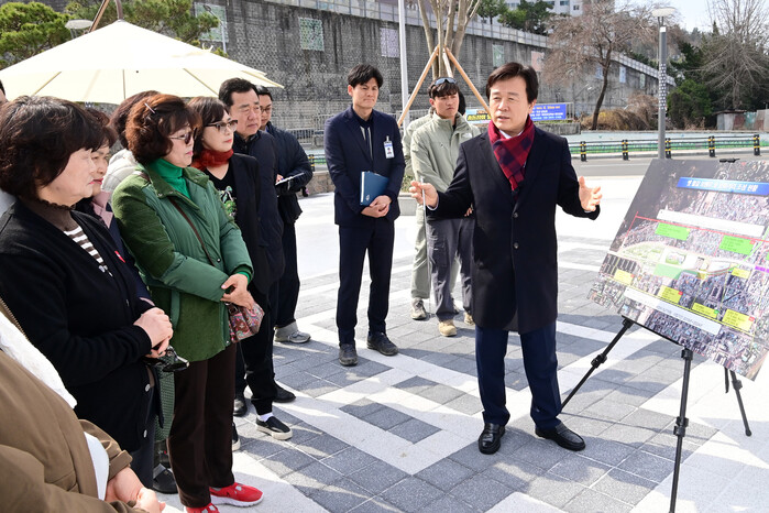 조규일 진주시장은 22일 망경동 소망의 거리 인근 ‘소망·희망광장 조성사업’ 현장을 방문해 공사 관계자들을 격려하고 사업현장을 점검했다.
