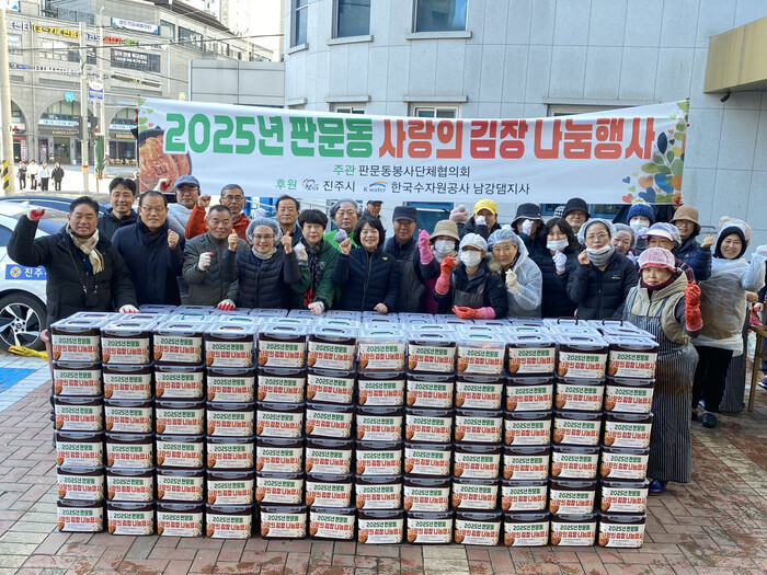 진주시 판문동 자원봉사단체협의회(회장 양태영)는 4일 판문동 행정복지센터 주차장에서 ‘사랑의 김장 나눔 행사’를 개최하고 기초생활수급자, 차상위 가구 등 취약계층 500가구에 겨울철 김장 김치를 전달했다고 밝혔다.