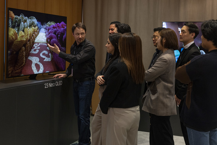 | ▲ 23일(현지시간) 독일 프랑크푸르트에 위치한 삼성전자 독일법인에서 열린 '2023 유럽 테크세미나' 참석자들이 삼성전자의 2023년형 Neo QLED 신제품을 살펴보고 있다.(사진제공=삼성전자) |