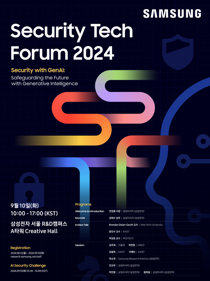 삼성전자에 따르면 올해로 8회째를 맞은 이번 '삼성 보안 기술 포럼'은 '생성형 AI와 함께하는 보안: 생성형 지능과 함께 안전한 미래로 (Security with GenAI: Safeguarding the Future with Generative Intelligence)'라는 주제로 진행된다.