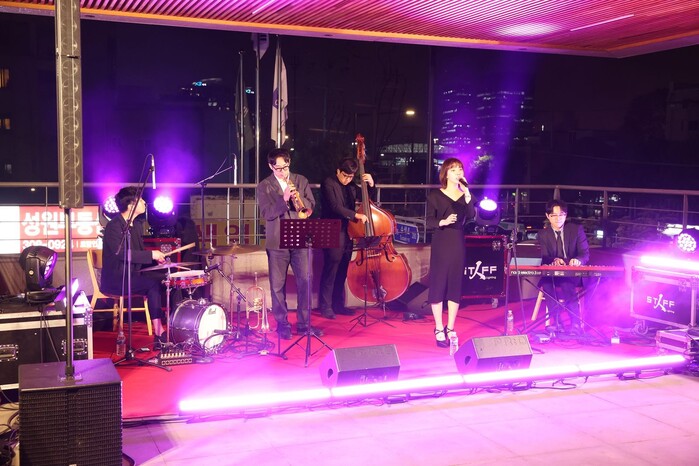 행사 둘째 날인 지난달 25일에는 주민센터 2층 외부 테라스로 이어지는 공간에서 유혜린 5인조 밴드가 이끄는 ‘재즈피넛’ 공연이 펼쳐졌다. 정통 재즈보다는 대중적인 곡들을 재즈로 편곡한 노래로 연주됐다.