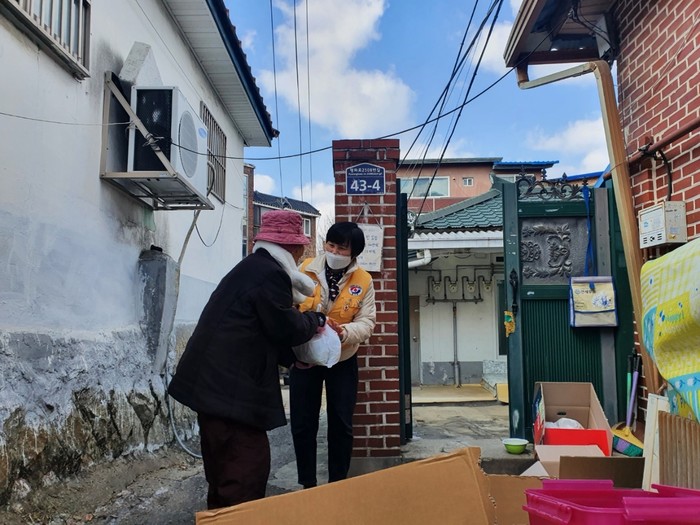 경기 동두천시 생연1동 평화로봉사회는 최근 지역사회보장협의체 위원들이 발굴한 대상자 10가구에 건강 영양죽을 지원하면서 노인들의 안부를 확인했다. 사진은 봉사자가 대상가구를 방문해 영양죽을 전달하는 모습.(사진제공=동두천시청)