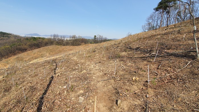 | 봄철 나무심기(흰 막대 꽂아 놓은 곳이 나무 심은 곳임 |