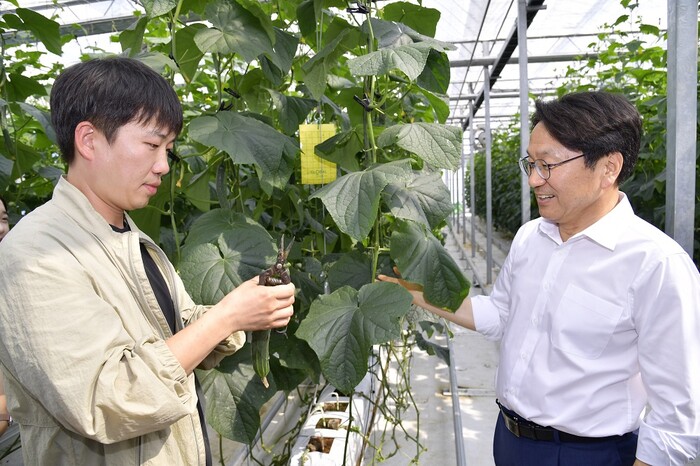 | ▲ 강기정 광주광역시장이 지난 15일 오후 광산구 농업기술센터에서 열린 정책소풍에 참석해 청년창업농 인큐베이터 농장 시설을 살펴보고 있다./광주광역시 제공 시계 |