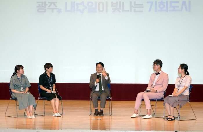 | ▲ 강기정 광주광역시장이 지난해 7월 5일 오전 시청 3층 대회의실에서 열린 정례조회에 참석해 '시장님 당황하셨어요?'라는 주제로 '시청 공직자와 토크'를 하고 있다. |
